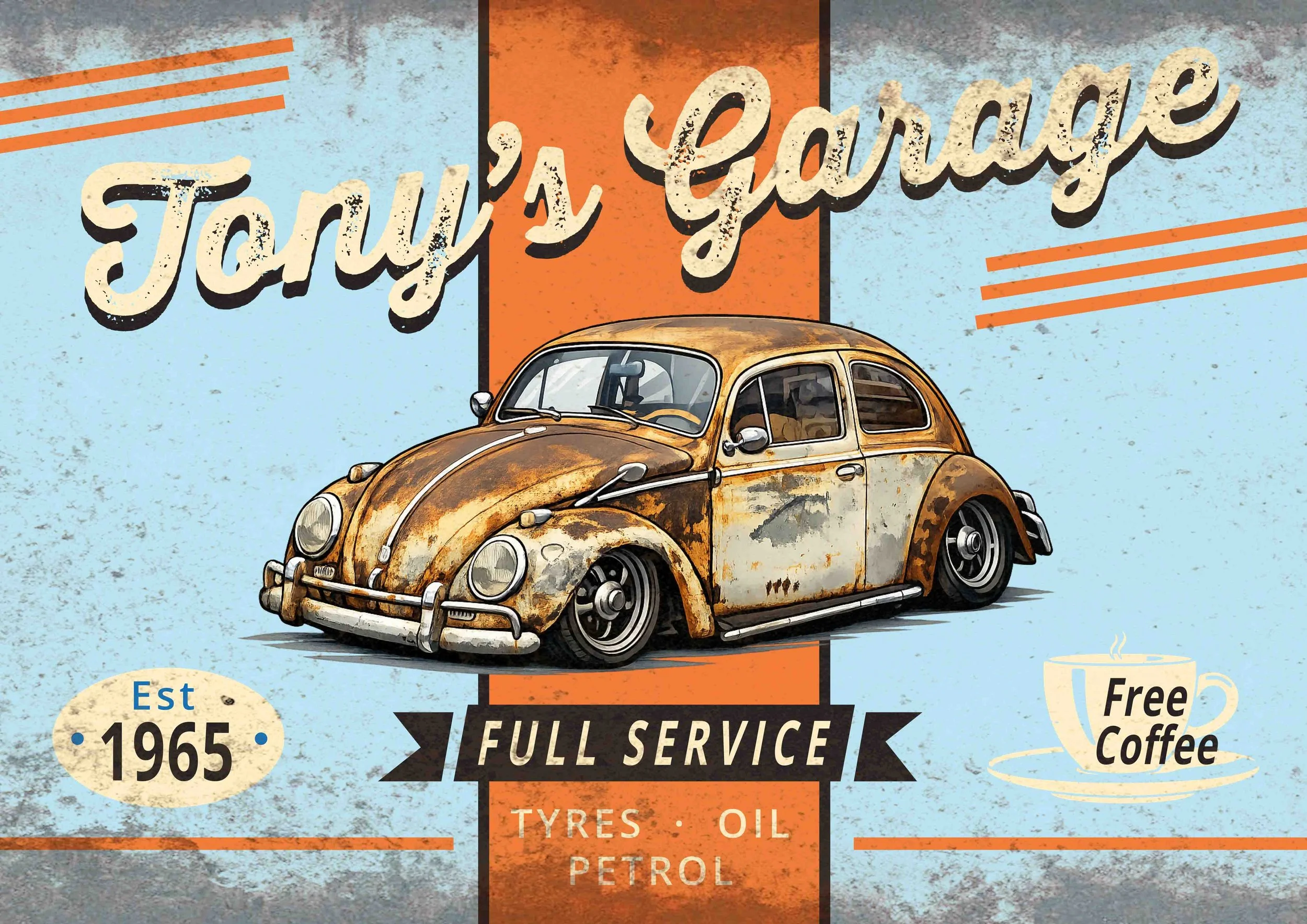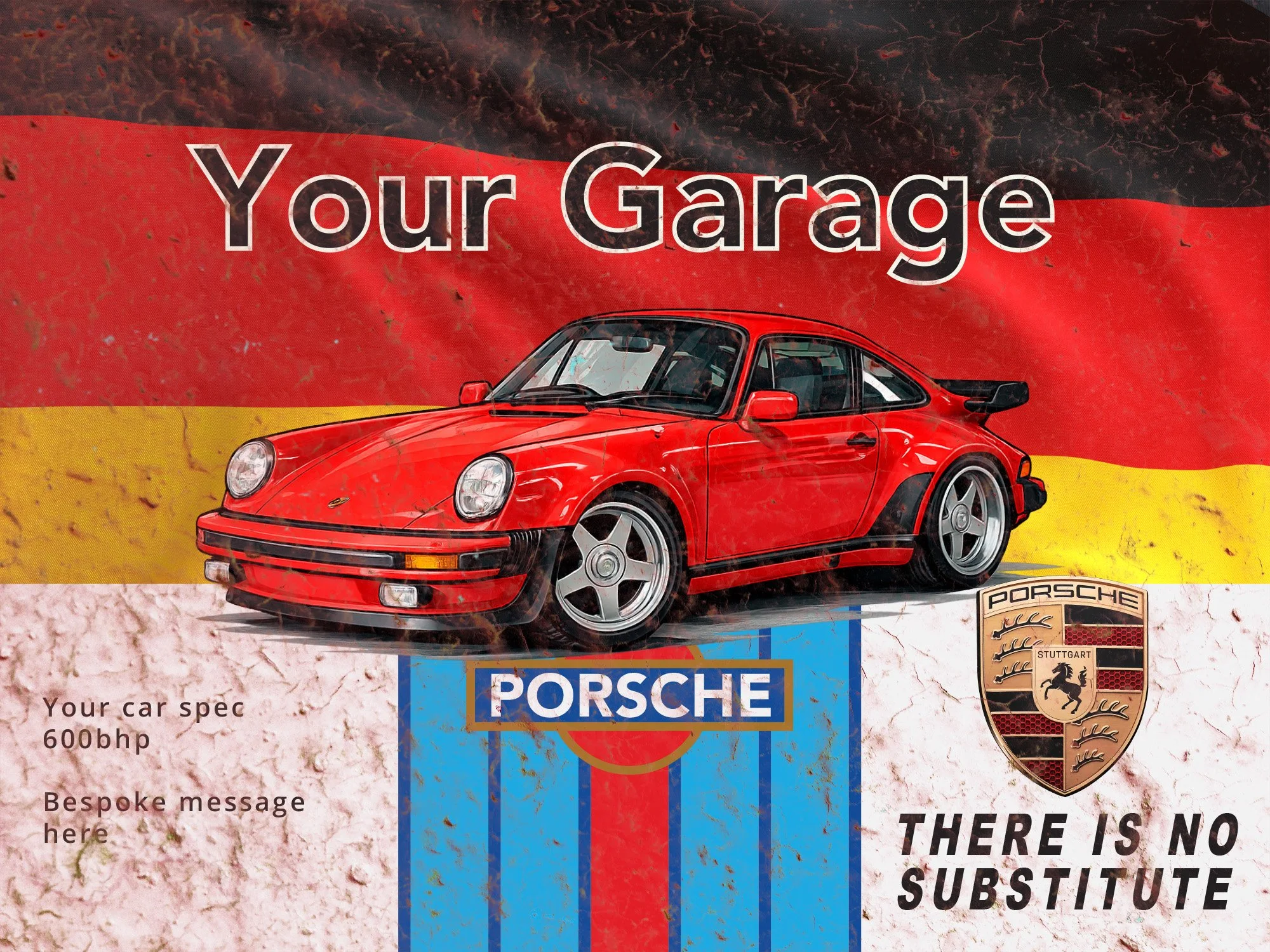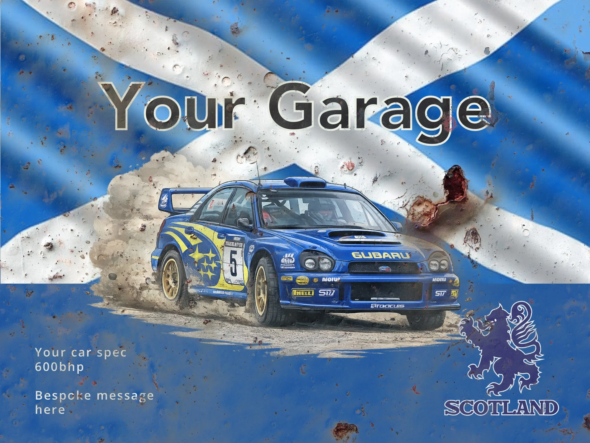 All designs can be personalised with your own car photo, colours and wording. Additional rust-effect can be added and placed anywhere