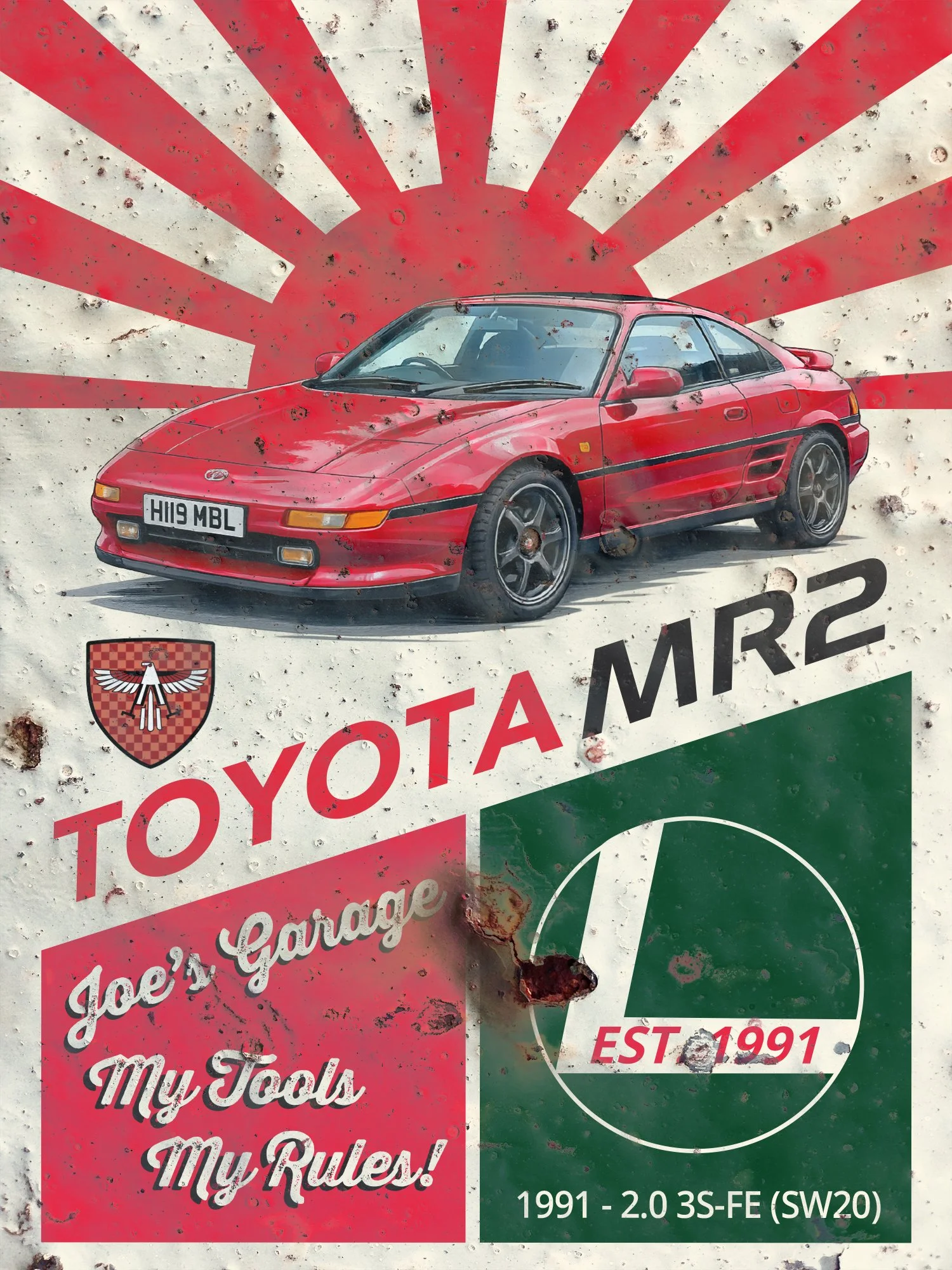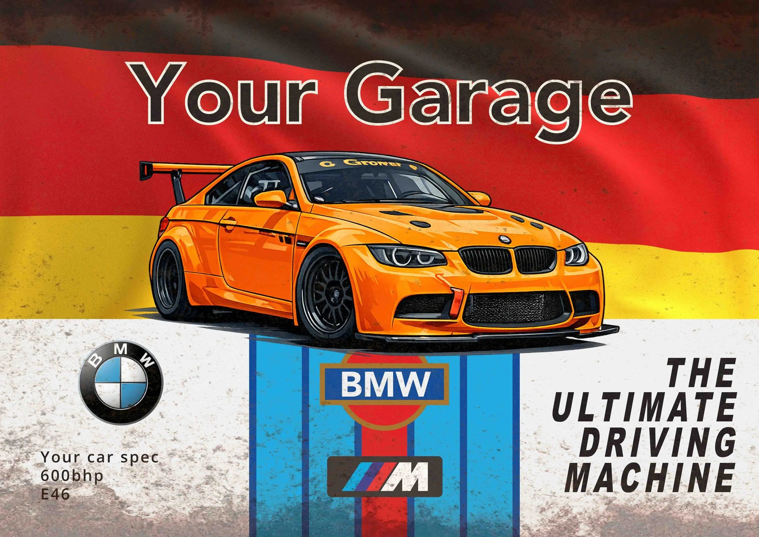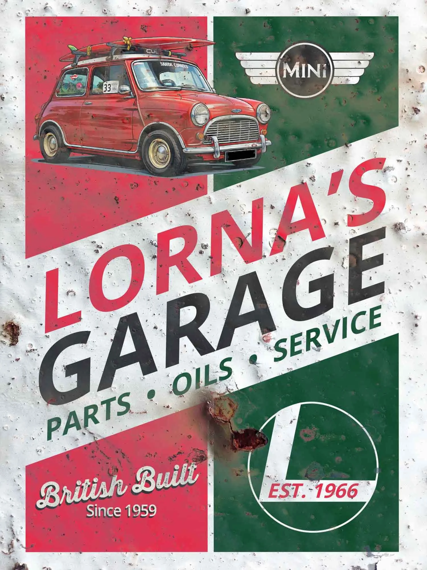 All designs can be personalised with your own car photo, colours and wording. Additional rust-effect can be added and placed anywhere